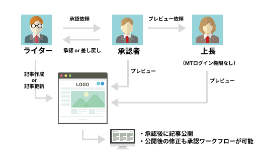 ・最終承認者:記事の承認(=公開)/差し戻し 同順位承認者の複数承認が可能です。 ワークフローグループは、ライターが承認依頼時にワークフローグループを選択し、以降はそのグループに属する承認者のみが記事を承認・差し戻しできます。オプションで公開後の記事についてライターは別のワークフローグループを選択することが可能です。