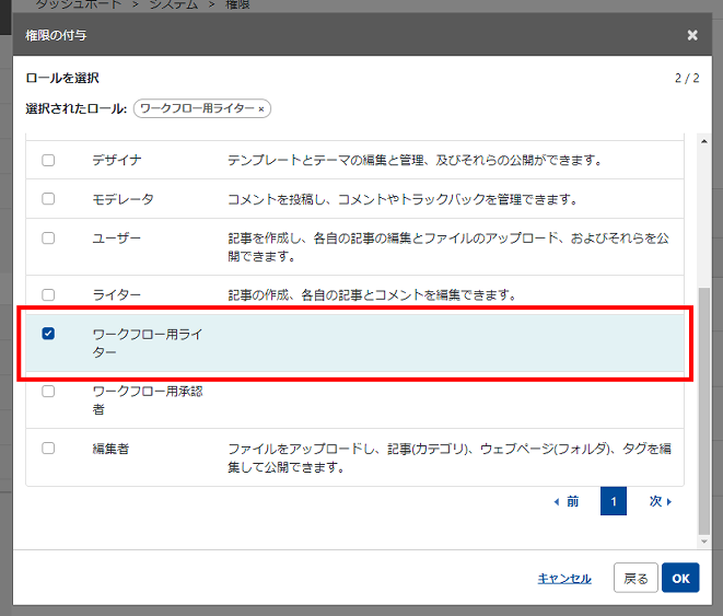 表示されたロールの一覧から、さきほど作成したロール(ここでは「ワークフロー用ライター」)をチェックして「次へ」をクリック。