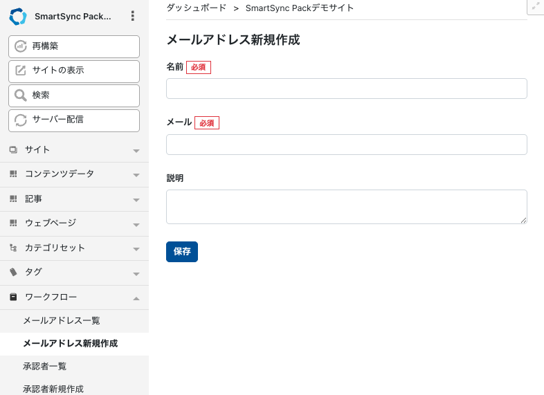 サイト管理画面またはシステム管理画面の「ワークフロー」→「メールアドレス新規作成」をクリックして、プレビュー者を登録します。システム管理画面で登録したユーザーは、すべてのウェブサイトでのプレビュー者となります。