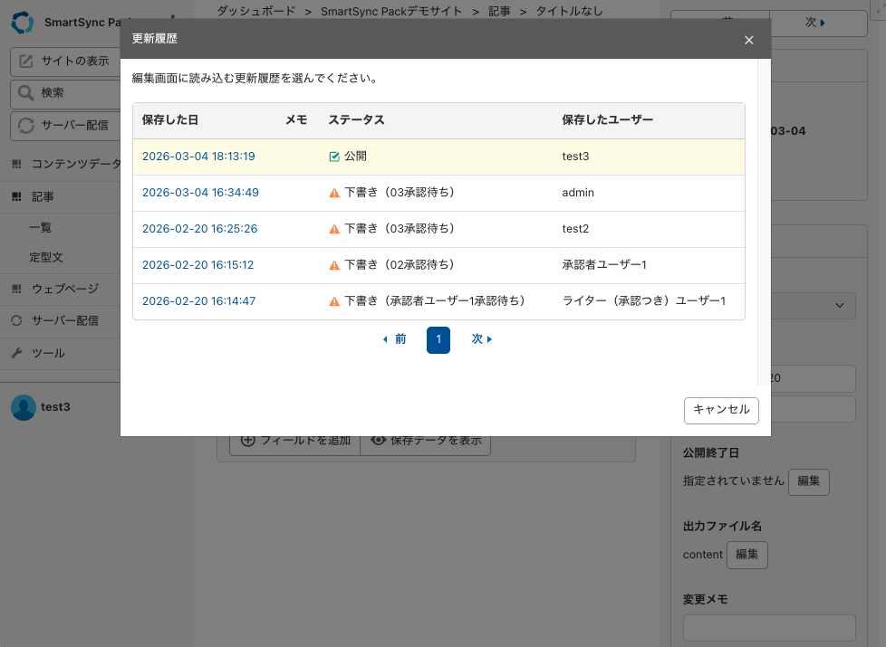 記事編集画面の「リビジョン表示」をクリックすれば、承認ワークフローのリビジョンを表示し、任意のリビジョンをクリックすれば記事の内容を元に戻すことができます。